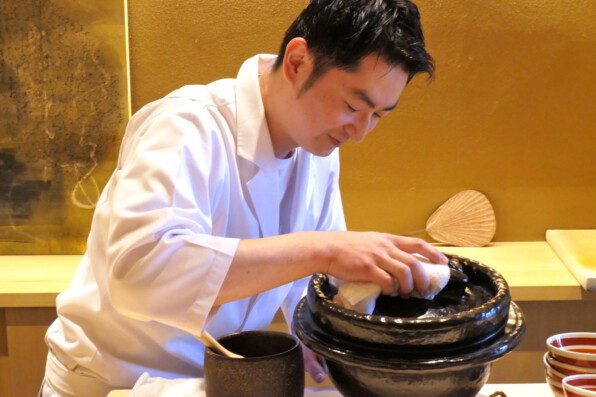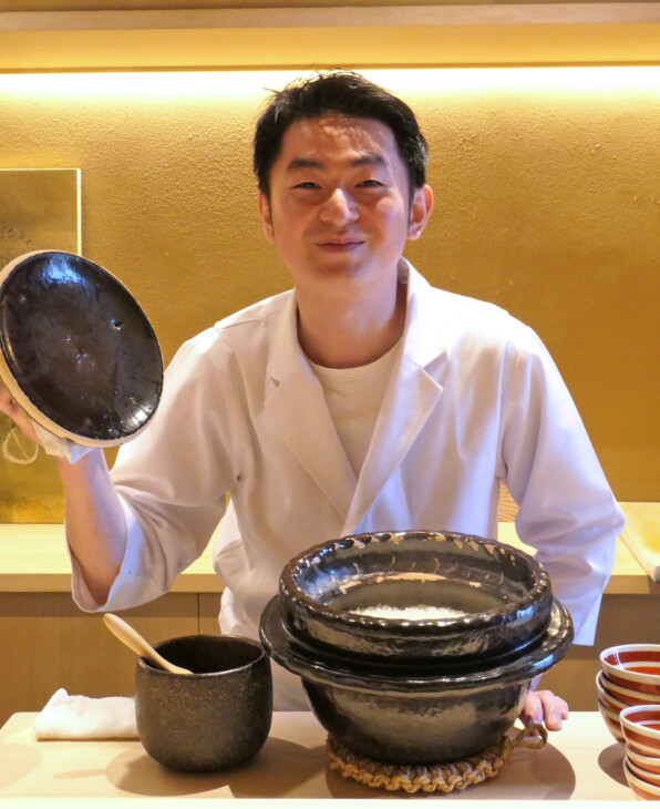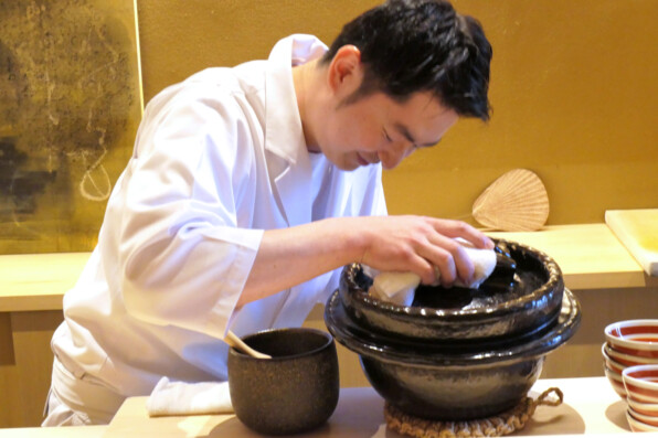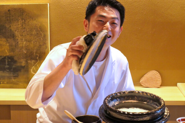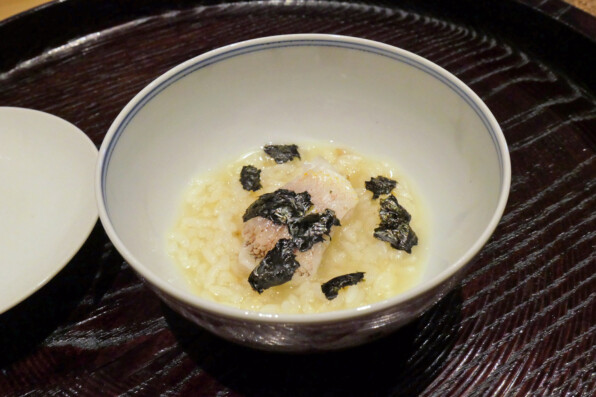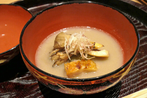 きのこのすり流しは鶏もも肉塩焼き、焼き舞茸、揚げた茄子入りでものすごく充実のお椀、