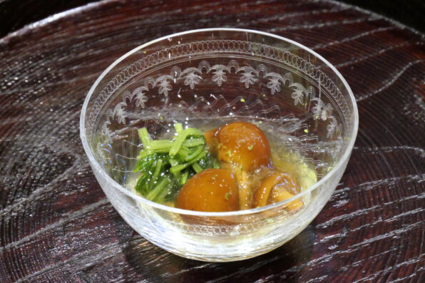 ●ジャンボなめこと壬生菜のおひたし、振り青柚子