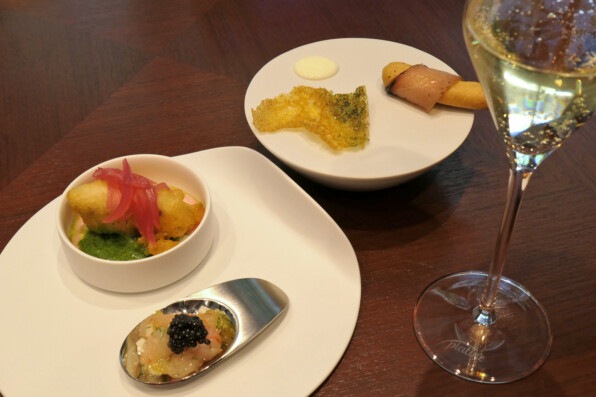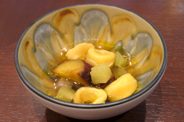 注がれているのは黒鶏のコンソメ。シルクスイート(さつまいも)とヴィタミン大根と共に。斬新な組み合わせです。