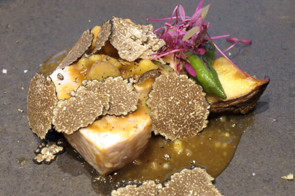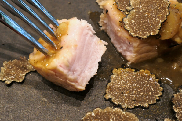 ●7皿目、豚ロース肉のマルサラと栗のソース、目の前でおろしたてのトリュフと。