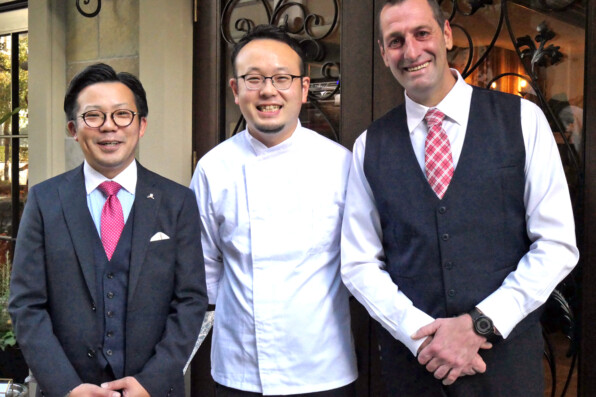 ●左から、ゼネラルマネージャーでサーヴィスの城念大輔さん、料理長の酒井飛雄樹さん、ホールマネージャーのSimone Visigalli シモーネ ヴィジガッリさん。
