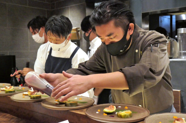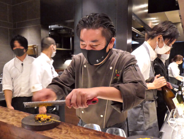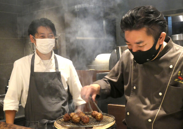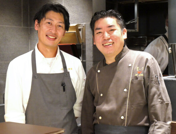 ●「侘家古暦堂」総料理長の秋山達行さんと、「青いけ」青池啓行さん。