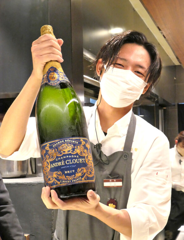 ●この大ボトルのシャンパーニュが注ぎ分けられ、侘家古暦堂さん、カウンターのお客さま全員で乾杯をしたのでした。