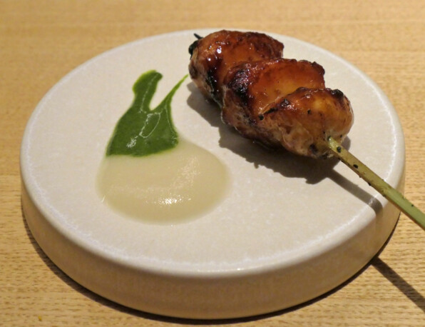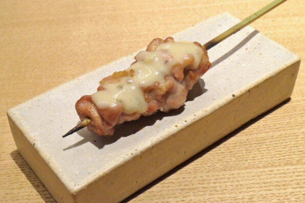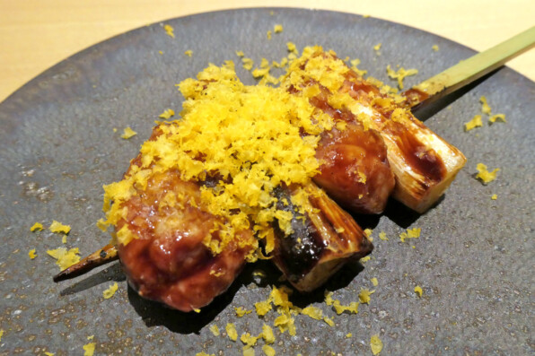 ●赤ワインソース風味のねぎま。上から、削ったミモレットのように見えますが、卵黄です。