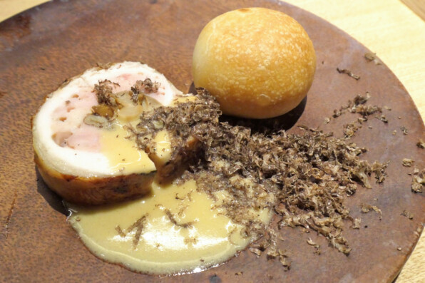 ●鶏肉バロティーヌ、中にきのこバターソテ入り。ノイリープラットを使ったソース、トリュフ。