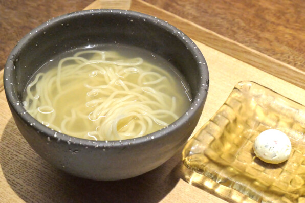 ●鶏だしに、こちらはあさりと昆布の旨味も配した、もう犯罪的に旨いスープに、中華麺の締め。エストラゴンバターで味変どうぞと。