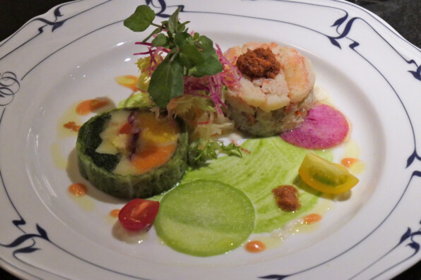 ●いつもの野菜のプレッセ=野菜みっちりのテリーヌ仕立てに、こっぺ蟹のセルクル仕立て。