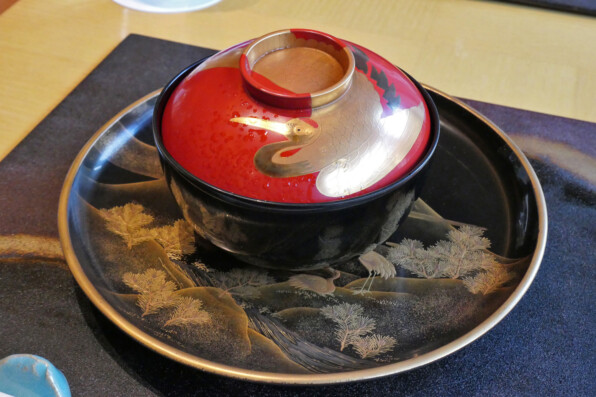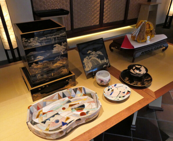 ●店内に入るとこのしつらいです。美麗な蒔絵のお重とお皿がプレゼンされていました。