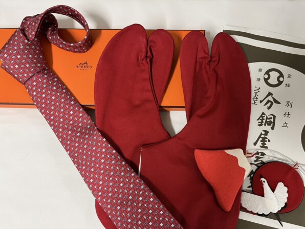●「分銅屋」さんの足袋と、わがメゾンH=「エルメス」のネクタイは、昨年の還暦祝いで贈られたものなのだそうです。
