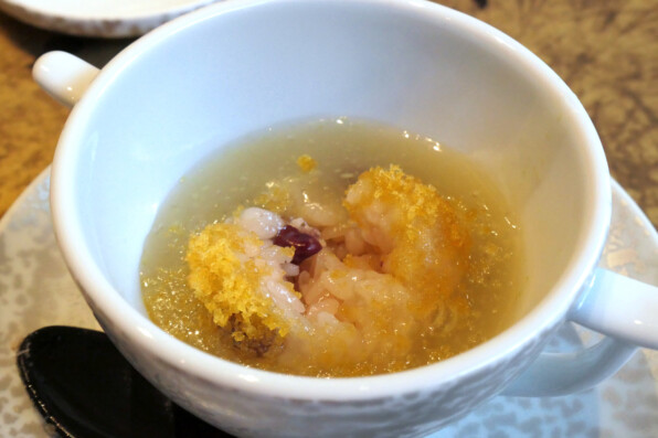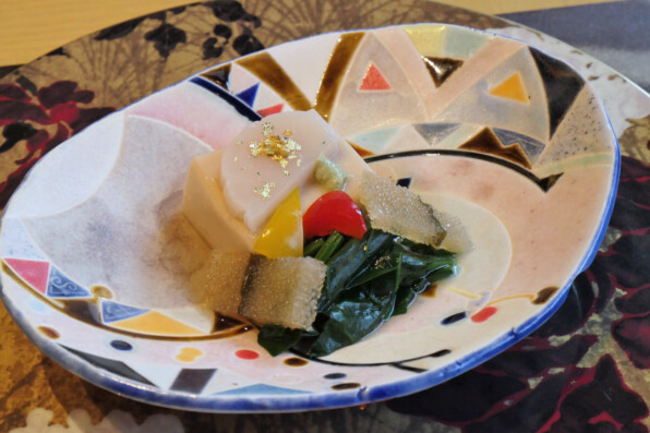 落花生豆腐、帆立貝、子持ち昆布、ほうれん草、赤パプリカ、美味出汁。