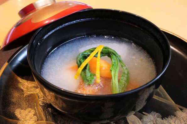 ●お椀はみぞれ仕立てで、金目鯛おかき揚、揚餅、聖護院蕪、芽蕪、にんじん、柚子。