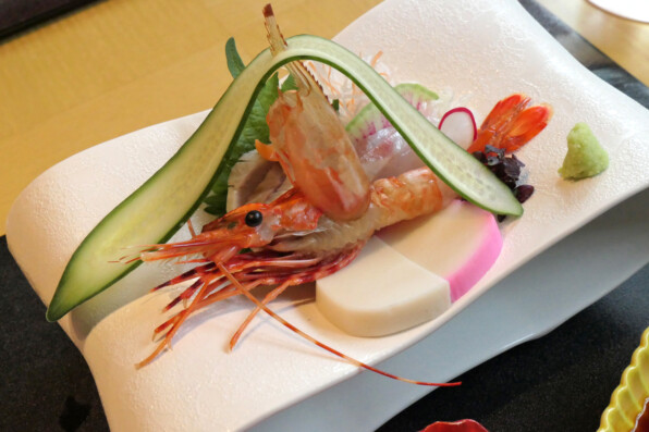 ●お造りは鯛、鰤、ぼたん海老。宝船の帆に見立てたきゅうり。