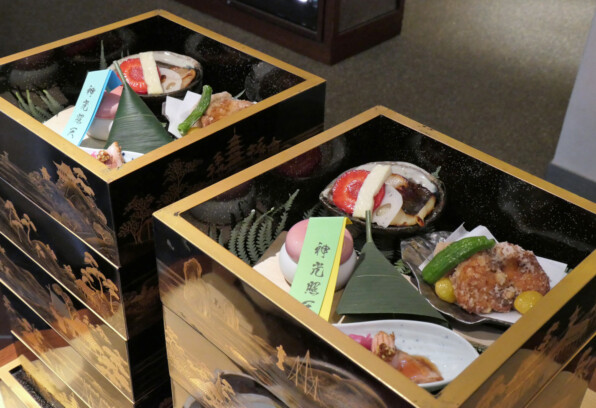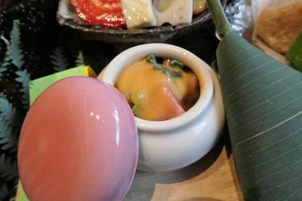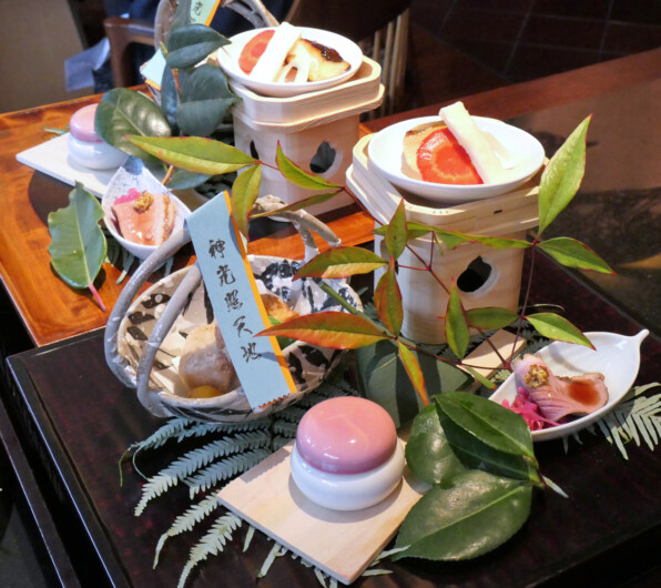 ●お重で、折敷に三方でと、華やかに焼き八寸が供されました。