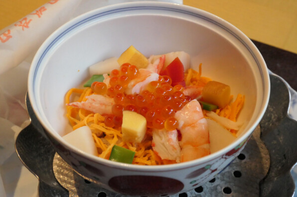 ●身体が温まる蒸し寿司で締めです。彩りよく、錦糸卵、いくら、海老と明るい色使いでうれしい(^o^)