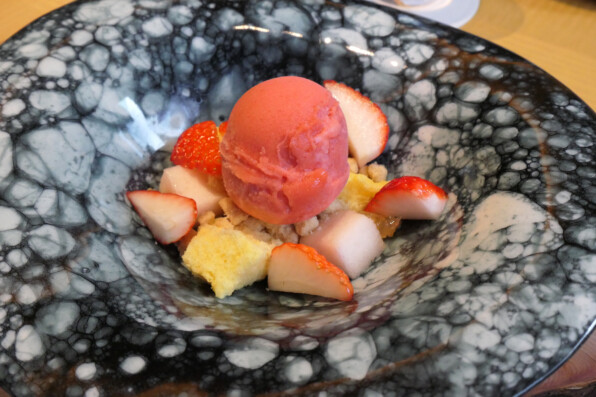 生姜味のジェノワーズに、いちごソルベ、いちご。