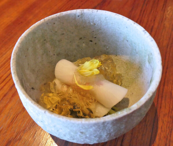 ●蟹を千枚かぶらで包んだものに、だしのジュレ