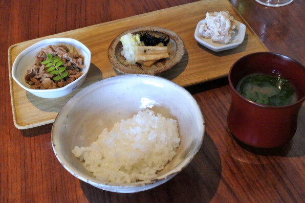 ●白ご飯(和久傳米)と共に、牛しぐれ煮、自家製の漬物、数の子の酒粕漬。