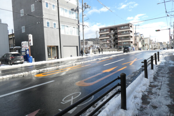 ●東大路通り冷泉上ル。だいぶ雪が溶けた後でも、こんなだったのです。わたしもさすがに自転車では出かけられず、四条烏丸からタクスィ~で、と思うも、まるで見当たらない。しかしバスはどんどん走っていたので、初めてここに来るのにバスを利用・・・なかなか便利でした。
