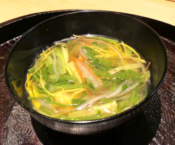 その後供された沢煮椀。芹、ごぼう、大根、にんじん、中に草餅、鶏肉。