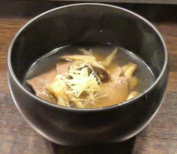 ●肉吸い=肉のお吸い物でスタートです。平茸、舞茸入り。