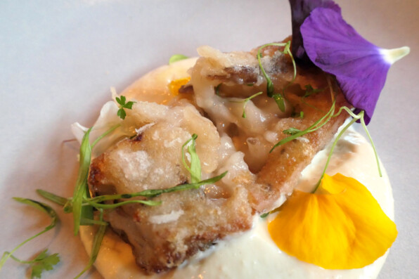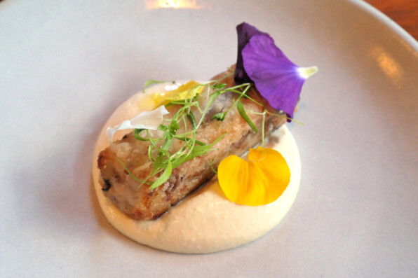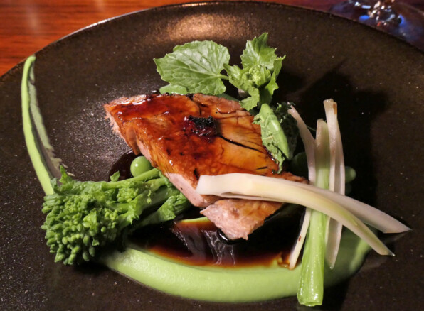 ●春野菜の酢豚。酢豚といってもまるで酢豚っぽくなく、低温調理(68℃で18時間)された豚肉はほろほろくずれて口当たりよし。黒酢の甘酢。