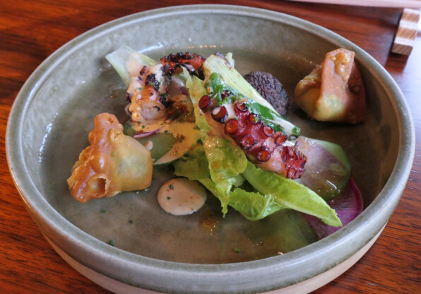 ●真蛸の炭火焼きサラダに、パリパリの食感が心地よい揚げ海老ワンタン。