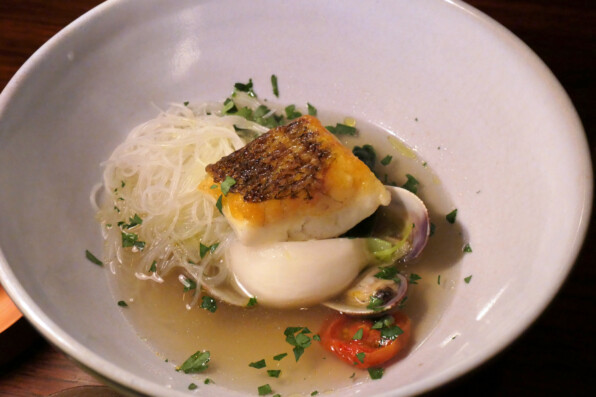 ●アクアパッツァ、これはいつものKYOTO BISTROスタイル。真鯛、蕪。あさり、ドライトマト、いぶりがっこ入り。