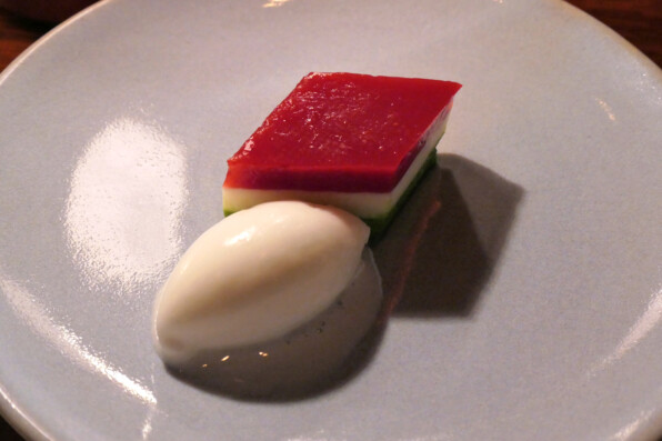 ●三色ゼリー、ひし餅形。下から抹茶、ココナッツ、フランボワーズのジュレ。白酒アイスクリーム。