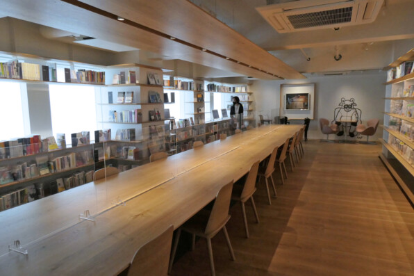 ●90分入れ替えで1回40名の予約制。村上春樹さんの今までのすべての著作と、世界50カ国以上で出版された翻訳本が展示されておりすべて手に取って見ることができます。