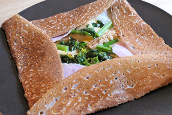 ●京野菜のガレット 1680円。長岡京の筍と、伏見の野菜農家木下さんからの「京ラフラン」という茎がアスパラガス、葉がほうれん草のような野菜のガレット。+ジャンボンブランとフロマージュ、たまご。