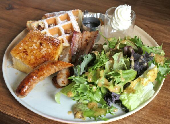 これはフレンチトーストかワッフルの選択のところを、2名だったのでシェアして両方いただいた之図です。