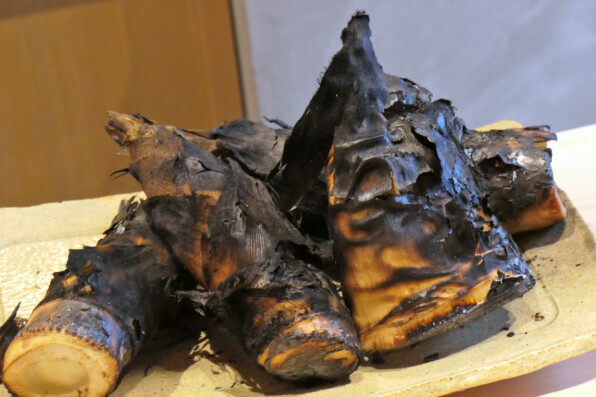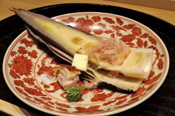 ●かつおぶしとバターをのせた筍に、鶏もも肉塩焼きを添えて供されました。