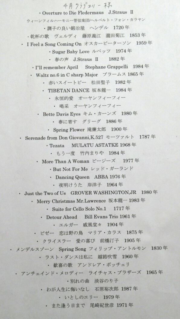でも実はここにリストアップされている曲だけではなく、たとえば雨だったので「雨に唄えば」なんかが挟まれたりもして、一層楽しい構成になったのでした。