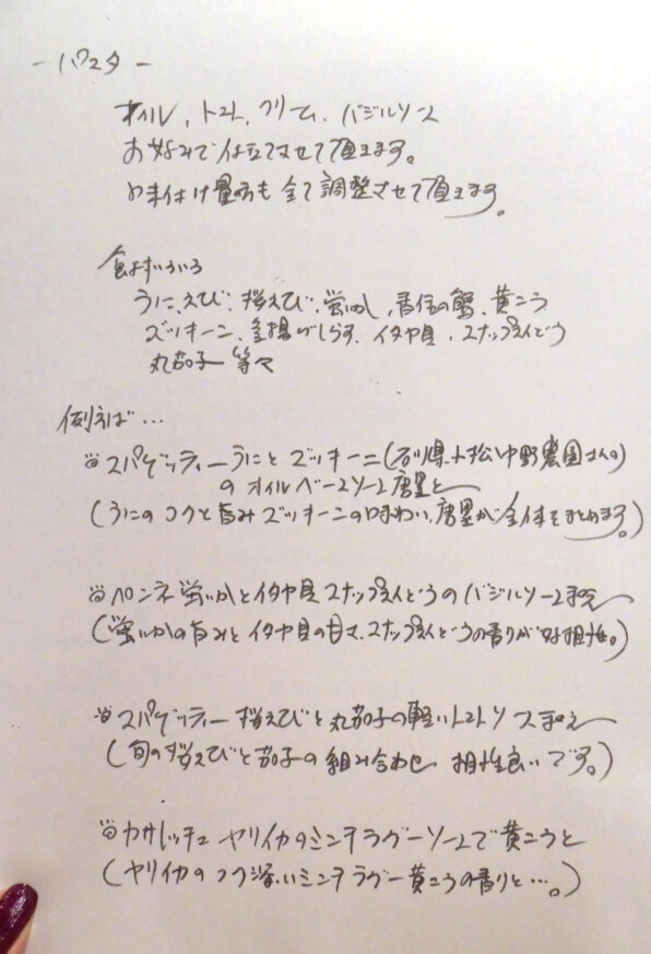 ●細切りにしてパスタにそわせるようにしていたから、「おいしいけれどもったいない。もっと厚みを持った形で食べたい、」と言うのと同時に、
