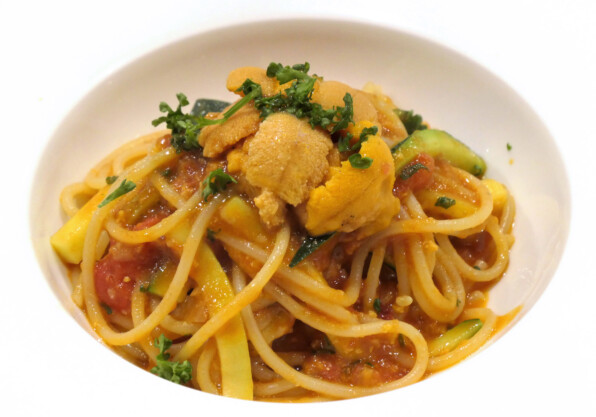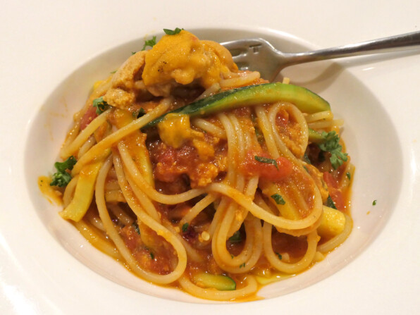 ●〆パスタ、今回は雲丹と、ズッキーニ農家が作るスペシャルズッキーニのスパゲッティ、自家薬籠中ソース(=軽めのトマトソース)。