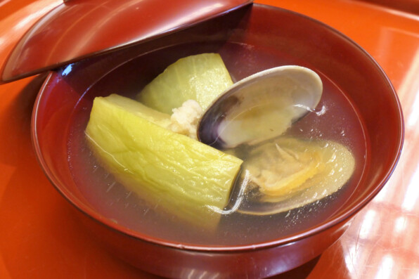 ●煎り玄米とあさりだしのお椀、あさりと賀茂茄子。