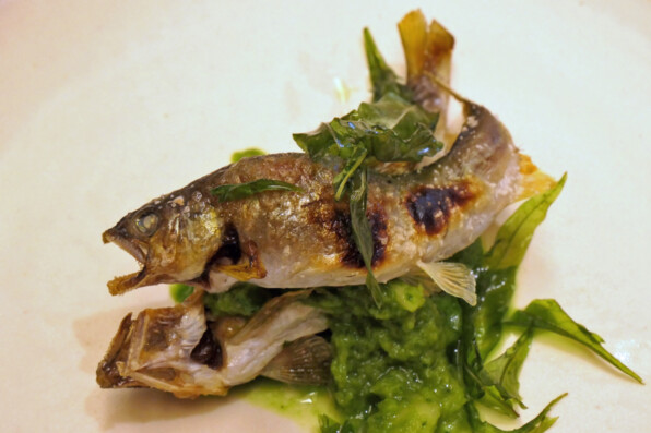 ●鮎塩焼き。パリパリの食感よし、胡瓜とクレソンの彩りも香味も鮮烈。