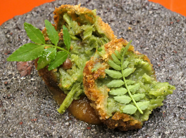 ●新じゃがのコロッケ、うすいえんどう豆とたらの芽、こごみで中身は彩り美しい緑色。野菜たっぷりの自家製ウスターソースと。