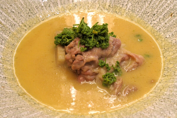 ●花山椒と牛肉。濃厚野菜ポタージュの白味噌風味。