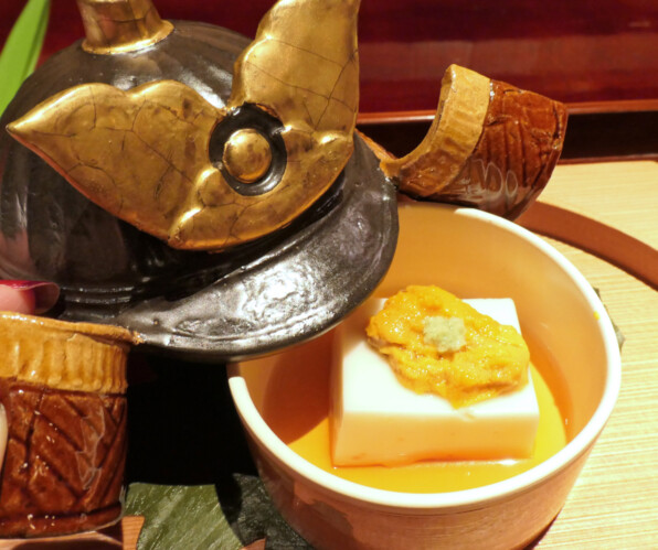 ●かぶとの形に作られた蓋を開くと、雲丹と胡麻豆腐があらわれました。
