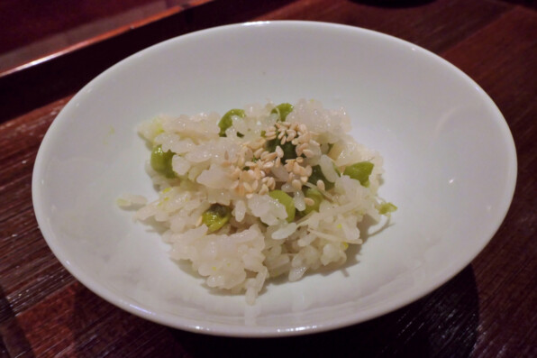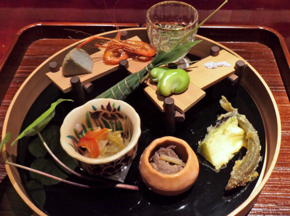 ●秋田のじゅんさい、柚子の香りの効いただしと共に。琵琶湖の鮎、泉州の水茄子の天ぷら、牛肉と新生姜のしぐれ煮、あぶらめの新子と玉ねぎマリネ、蛸の子、川海老、そら豆。