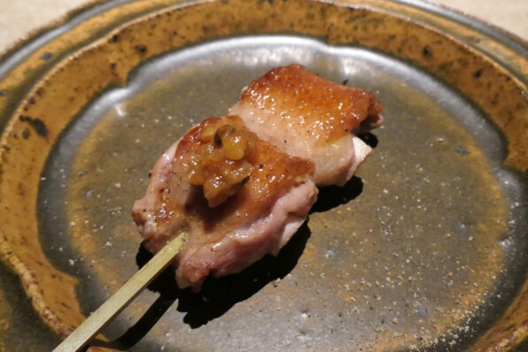 ●薪の火で、たれつけ焼きもも肉、すね肉。奈良漬け、鷹ケ峯とうがらし