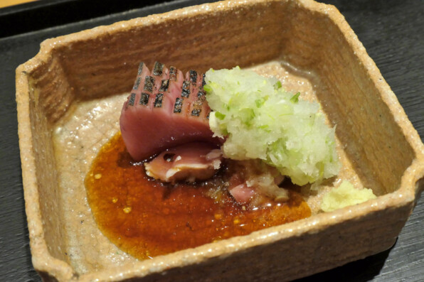●こしびまぐろ、皮を炭火で炙ってある。九条ねぎの黄色いところを混ぜ込んだ大根おろし。とろっと葛仕立ての土佐醤油には、ねぎと生姜の香りの油で風味付け。