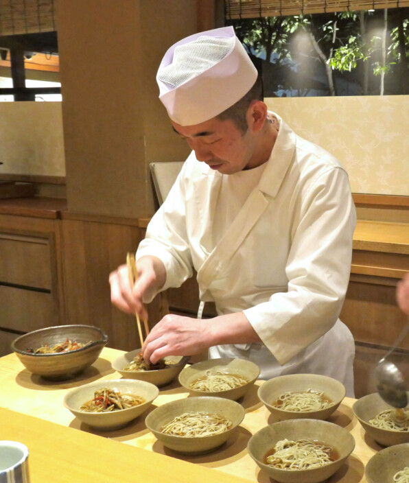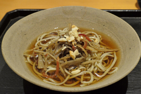 ●きんぴらをのせた蕎麦、温製。きんぴらは堀川ごぼうと金時人参。揚げたナッツ(胡桃とカシューナッツ)がパリパリの食感を添えて粋。7種のきのこと鯖節のだし。