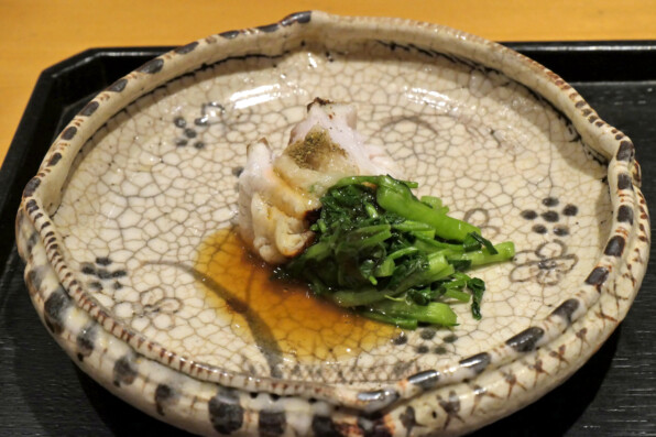 ●ふぐのてっさの酢味噌和え。酢味噌は葉にんにく、アーモンド入り。土佐酢あん。
