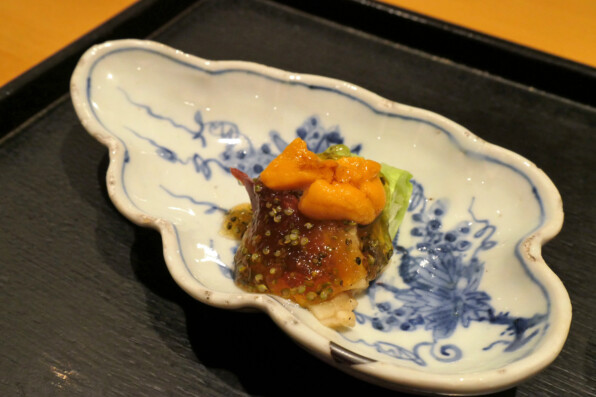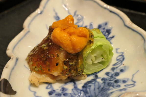 ●炙ったほっき貝。上から土佐酢ジュレ、とんぶり入り。雲丹と、焼いたキャベツ巻きと。