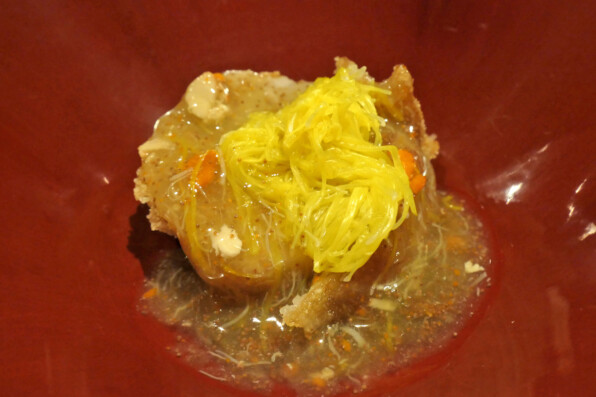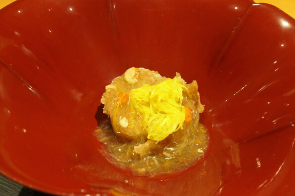 ●揚げた海老芋、衣は煎って粉末にした道明寺粉。こっぺ蟹のあん。菊花は「龍のひげ」という花弁が極細の菊。