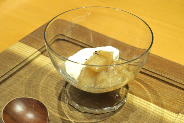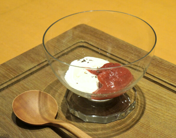 ●食後の甘味は豆乳ムース、リュバーブと。(リュバーブ=la rhubarbe)