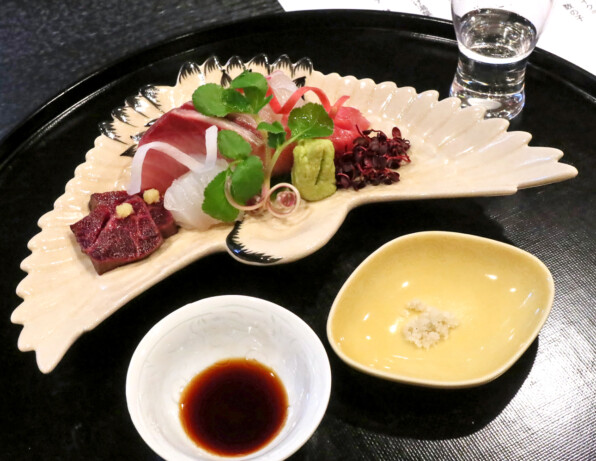 ●鶴のお皿に、お造り4種・・・ではなく5種盛りにしてくださいました<(_ _)>