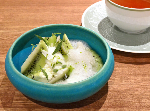 キウイに、ナチュラルヨーグルトで作ったCrémet d’Anjou クレメダンジュ、白ワイングラニテ、キウイのピュレ、ライムの香り。ライチの泡。セージ、マイクロタイムなどなど。